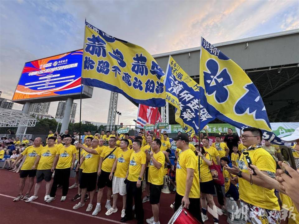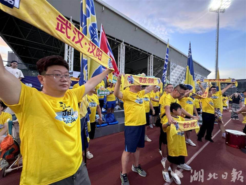 “蒜鸟,蒜鸟,你踢不赢汉阳滴。”汉阳球迷方阵身着统一黄色上装,高举双手、摇旗呐喊,数百人在看台一侧形成一条金色的人浪。