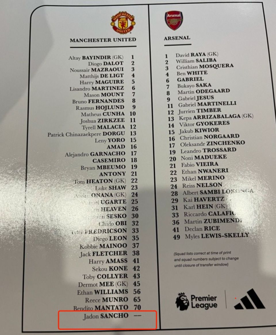 今日凌晨,英超首轮全面打响,曼联主场0-1阿森纳。赛前,25岁的桑乔疑似遭到曼联公开羞辱。赛前大名单上,桑乔的名字也在里面,却没有号码!
